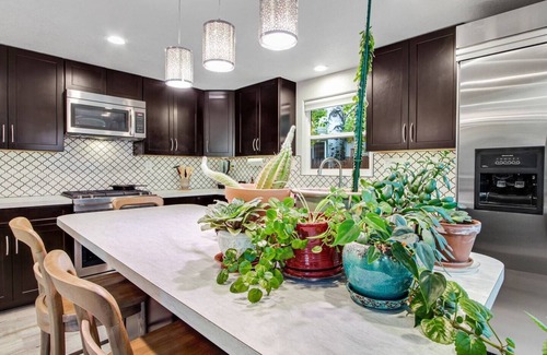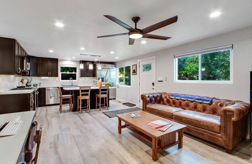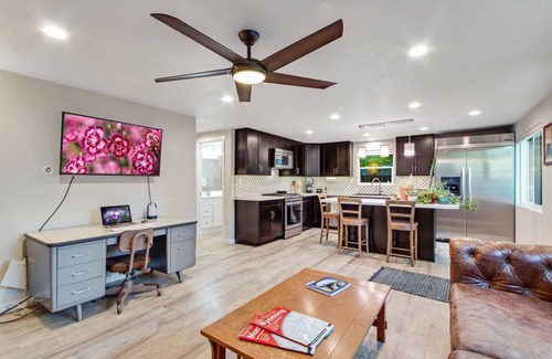 The fully equipped kitchen boasts modern appliances, cookware, dishes, utensils, and spices. All you need to bring are your groceries. The space includes a dining island with counter-height chairs and a cozy living area that doubles as a workspace if needed.