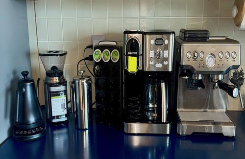 The house blends in nicely with its natural surroundings and is well-appointed with hardwood and ceramic tile floors, floor-to-ceiling casement windows, and ceiling fans in every room. The living room has a wood-burning stone fireplace. The dining table seats 8 and the kitchen has everything you should need. High-speed fiber internet is available throughout the house. There is a high-definition 50-inch TV with Apple TV and a variety of streaming services including access to all the common cable and local channels along with DVDs and a stereo with connections for your audio devices. The master bedroom has a king bed, TV, and a private bathroom with a walk-in shower and heated tiled floors. The main bathroom has a tub and shower. The second bedroom has a double bed as well as a single bed suitable for a child. The third bedroom is located downstairs accessed by a spiral staircase and has a double bed, a sleeper sofa, and two trundle beds. (The spiral staircase could be a challenge for older people or someone with mobility limitations.)