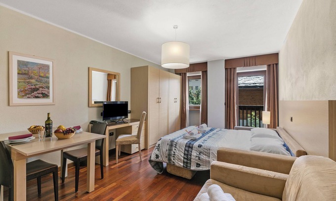 This well-equipped retreat has all the modern conveniences: Wi-Fi, central heating, Smart TV, and a laptop-friendly workspace. The kitchenette is perfect for self-catering with an induction hob, coffee machine, electric kettle, microwave, dishwasher, and fridge. Nestled among lush greenery in a sunny, quiet location, the residence offers pet-friendly options on request and a convenient lift. Ski enthusiasts will appreciate the ski storage and proximity to the ski shuttle bus, plus it is just a 10-minute drive to Jafferau slopes.