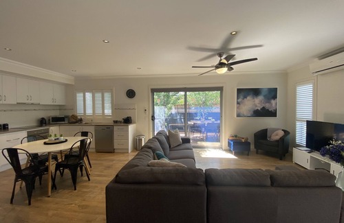 Ideal for Families or Groups Travelling together the Apartment has 3 Bedrooms, Two Bathrooms (Ensuite to Main Bedroom), Fully equipped Kitchen includes Oven, Stove Top, Microwave, Full size Fridge & Nespresso Coffee Machine, Laundry Facilities (Washer/Dryer), Dining Area and Spacious Living room. Ceiling Fans in each bedroom, Reverse Cycle air-conditioning, LCD TV and DVD Player. BBQ and Table & Chairs located on rear deck. On site Car parking.