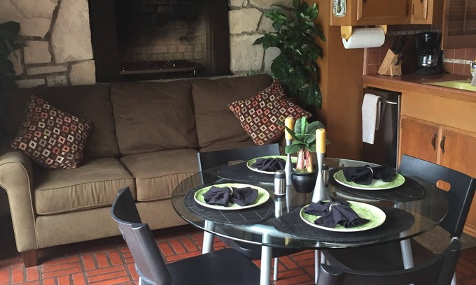 Two story Guest house has 1 queen bed in the combination living room/bedroom, a walk through area with built in bunk beds, bathroom with a shower, 32' Smart TV with DVD player and stereo, and a gas fireplace upstairs. Downstairs is the kitchen/wet bar/dining area with a fold out queen sofa bed, 19' Flat screen TV with DVD, gas fireplace and another bathroom with a shower on the lower level.