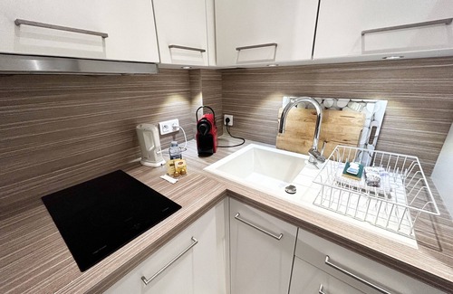 Your stay at this charming apartment includes a wealth of amenities to enhance your wedding experience. The living area features large windows that fill the space with natural light, creating an inviting atmosphere. Enjoy modern conveniences such as air conditioning, cable television, audio entertainment, and complimentary Wi-Fi. The contemporary open kitchen is fully equipped with everything you need to prepare meals, and a spacious dining area allows for intimate celebrations. A luxurious bathroom, complete with an Italian bathtub, adds to the overall elegance of this special accommodation.