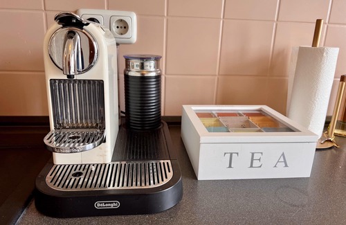 A welcome basket with treats and drinks awaits you. The kitchen, bathroom and desk are perfectly equipped with everything you need.