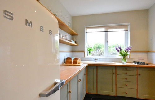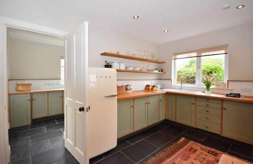 The kitchen is most definitely the heart of this house. The huge wooden table with low hanging lighting, the Aga stove, unique sage pink and mauve painted cabinets and the large antique rug covering the slate flooring combine comfort and function with style. There are two gas rings as well as the Aga, a Smeg fridge freezer, kettle and toaster.