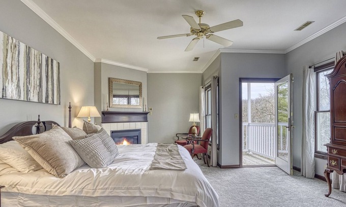 {ball – more – el} Canopied king bed, full bath with Garden Bath for two, fireplace, lazy ceiling fan and balcony overlooking the Dunrobin Gardens and Gazebo on the entry level. Two comfortable sitting chairs, desk and chair, WiFi (wireless high speed internet) Comcast Xfinity TV and closet. Light Continental breakfast are included.