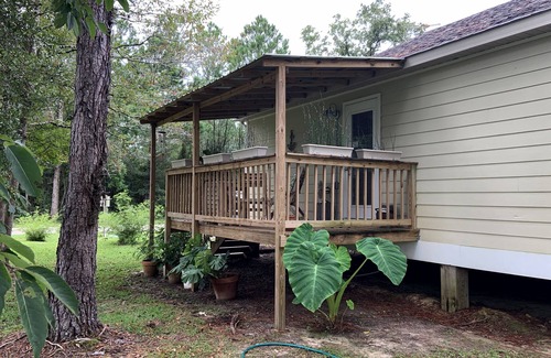 In WEST Bay St Louis - 8mi to historic downtown. Quiet green RURAL neighborhood alternative to main tourist area. 5mi to beach & Silver Slipper Casino; 23mi to Gulfport; 55mi to New Orleans. Comfy clean king bedroom guest suite (YOUR OWN PRIVATE: entrance, full bathroom, deck, large garden, A/C) ATTACHED TO QUIET RESIDENTIAL HOME. Host lives on property. Minutes to beaches, shops, galleries, casinos, restaurants. Self check in. Sit outside on private deck & garden w/fire pit to read, work, listen to birds & frogs, or to stargaze at night.