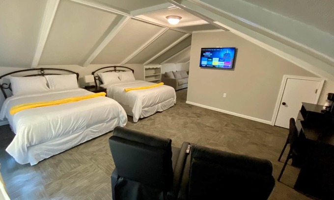 Our most spacious room, the Banana Split Suite, features 2 queen size beds, 2 flat screen TV's, a desk, dresser, sofa, and 2 recliners. This room features upgraded bathroom fixtures, including granite counter tops.This room has an adjoining door to the Pistachio Room, adding space for up to 2 more guests as well as another bathroom, if desired. We are in a great central location to Elizabethtown, Mammoth Cave, Rough River, & Nolin Lake.