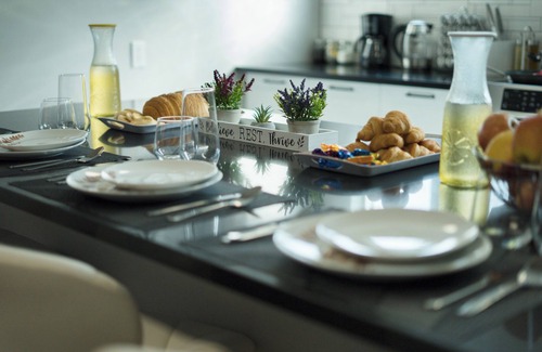You’ll find all the essentials ready for you — fresh linens, towels, soap, shampoo, coffee, and a few cooking basics like oil, salt, and pepper. The home also has central heating and air conditioning, high-speed Wi-Fi, a dedicated workspace, and an in-unit washer and dryer for your convenience.