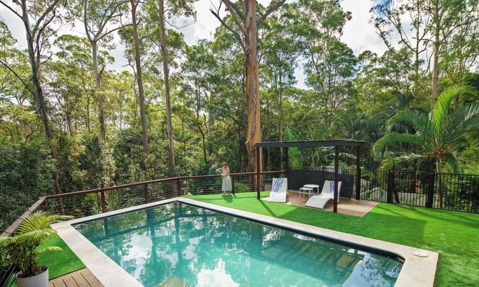 Discover tranquility at Bangalow Retreat in Buderim, a charming 4-bedroom, 3-bathroom haven nestled in the heart of the Buderim rainforest. Surrounded by lush tropical greenery, this serene escape with a pool is perfect for a relaxing family getaway. Immerse yourself in nature’s beauty while enjoying the comfort of a stunning home, located just a 3-minute drive from the renowned Buderim waterfalls walk and the main street, where you can explore an array of shops, parks, and cafes.