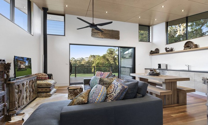 Architect designed using Sandstone, Timber, Glass and Birch, large contemporary space. Beautiful spotted gum flooring, large glass stacking doors that open out onto the decks. Jura automatic coffee machines. Breakfast supplies of bacon,eggs, muesli, milk, tea, coffee, seasonal fruits & champagne provided. High end kitchen, Miele appliances, luxury bathrooms with stone bath for two, stone basins, washing machines, outdoor temple pod with pillows, beautiful 100% pure linen sheets, luxury resort style furnishings. Seclusion and Luxury.