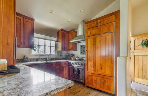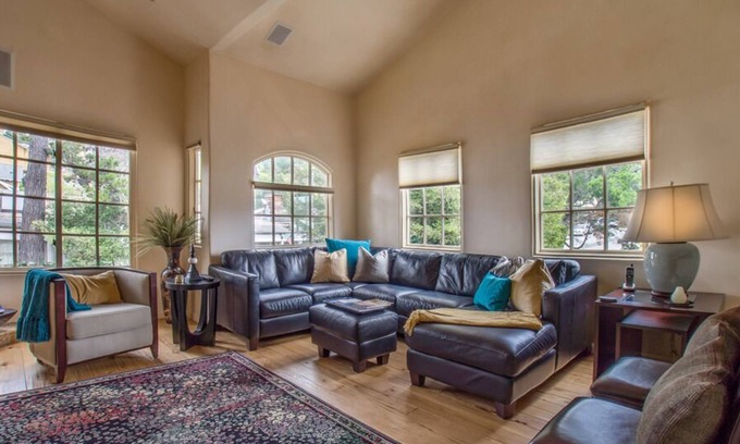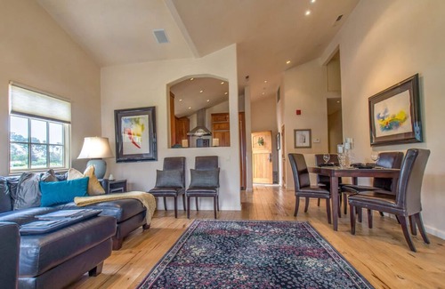 Why stay in a hotel when you can have a whole condo? The open floor plan of this downtown condo—with skylights and hickory floors—includes a cozy dining area and a living room with comfortable leather sofas, a flat screen TV and one of two gas fireplaces. And when you’re not taking advantage of the fine dining Carmel is known for, the kitchen features granite counter tops and stainless appliances. The master suite has a King bed, a fireplace, and a private bath with a large tub and a steam shower. The second guest room has a Queen bed, and the second bath, located in the hall, has a walk-in shower. Elevator access. Single garage (fits one small/medium car only) in the Carmel Realty lot on Junipero (1/2 block away). There is unmetered street parking on Junipero past 5th, and a free parking lot (no overnight) on 3rd, between Junipero and Torres. Carmel-by-the-Sea TOT License 25759 [enter desc]