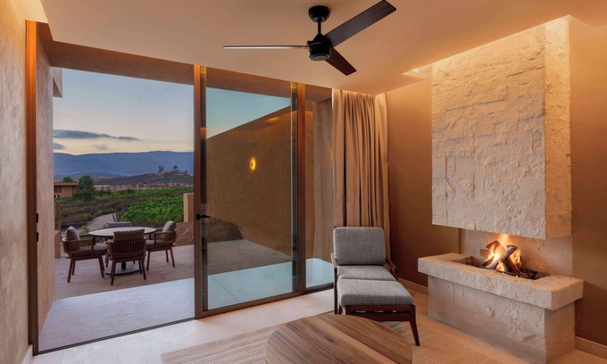 Best-rates for the Valle de Guadalupe hotel starts from $421 per night with includes Pet Friendly, Accessibility, Fireplace/Heating, Internet, Laundry, Parking, Security/Safety, Bedding/Linens, Restaurant, Bar, Entertainment, Balcony/Terrace, Wellness Facilities, Spa, Guest Services, Child Friendly, Hot Tub, Kitchen, Air Conditioner, Pool, Private Pool, Sports/Activities, Breakfast with all other amenities. Perfect for Weddings is committed to ensuring every guest experiences a comfortable and extraordinary stay, whether planning a romantic getaway, a honeymoon, a pet-friendly stay, or celebrating with the entire wedding party.