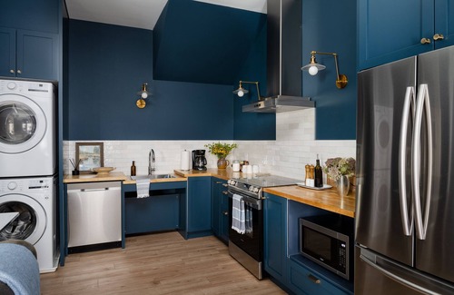 Each unit has a fully stocked kitchen featuring stainless steel appliances (electric range, microwave, French door refrigerator and freezer, and dishwasher) and butcher block countertops. You'll have everything you could reasonably need to cook your favorite meals--from utensils and dishware to plenty of pots and pans and basic cooking ingredients.