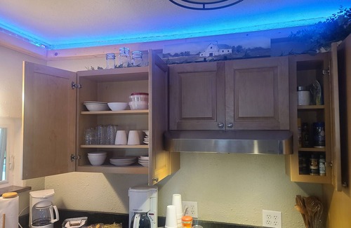 The bedroom features an electric adjustable bed tailored to your comfort, complemented by vibrant LED tray lighting that outlines the room—adjustable to suit your mood. This colorful lighting extends to the living room, creating a warm, inviting ambiance. The bathroom is fully accessible, with extra-wide doorways, a stairless wheelchair-friendly rain shower, and a convenient laundry area.