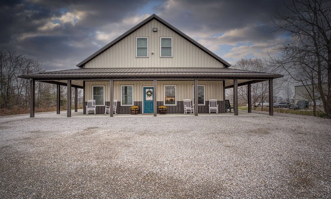 It's part home, part event space. Escape to our modern barndominium located in Newburgh! This home can accommodate up to 12 overnight guests with a large heated and cooled garage, great for entertaining with family and friends. Located right off the trail that runs into Friedman Park, this is a great location for those looking to get away from the city or for visitors attending events at the Park.