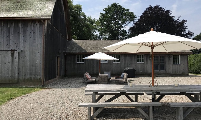 Privacy, Privacy, Privacy !! As you enter onto a long cobble stone driveway passing through 12 foot high privacy hedges to find a 1900 year old horse barn with beautiful farm views. The property is completely private with 15 foot evergreens around the property lines.. There are two bedrooms with queen beds, full bath and mudroom with washer and dryer. The kitchen has soap stone counter tops, stainless steel appliances and butcher block center island with a porcelain farm sink opens up to the living room with French door leading into the court yard. There is ample parking , one flat screen TV, HBO, Netflix, Show Time, and Hulu. There are two outside dinning areas the larger table sits 12 and a fire pit for chilly nights that sits 8 and a gas and charcoal grill. Two large umbrellas for shade. *Please close umbrellas at night*