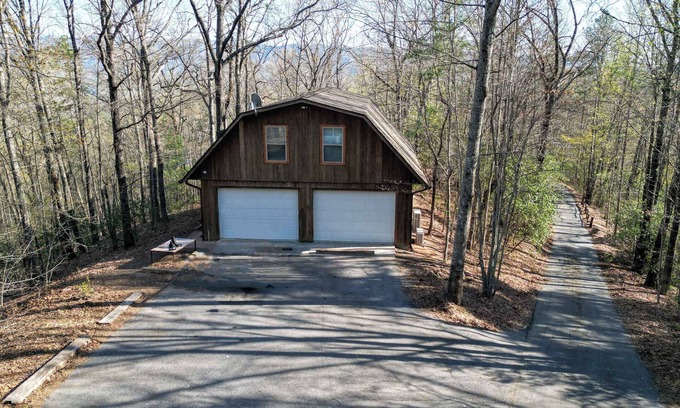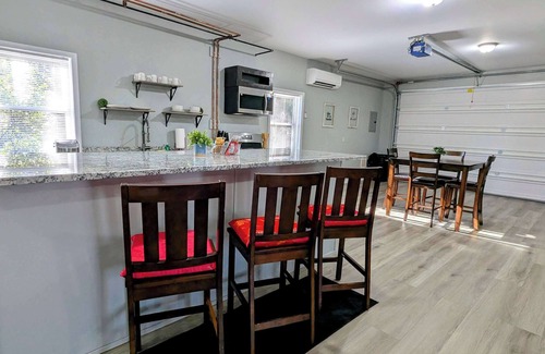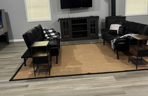 Explore this unique barndominium on nearly 60 acres! Pull in private drive to discover 1600 sq ft garage completely renovated to 2 story barndomenium with modern kitchen, granite island, washer/dryer, and game area featuring shuffleboard and arcade. Relax on leather futons or comfy loveseat, by the fireplace! Upstairs bedroom hosts two king beds with plush mattresses and separate sitting area with recliners. Free Wi-Fi included, two smart TV and fireplace! Surrounded by nature, you can explore or relax on large outdoor deck with grill! Perfect for families or couples!