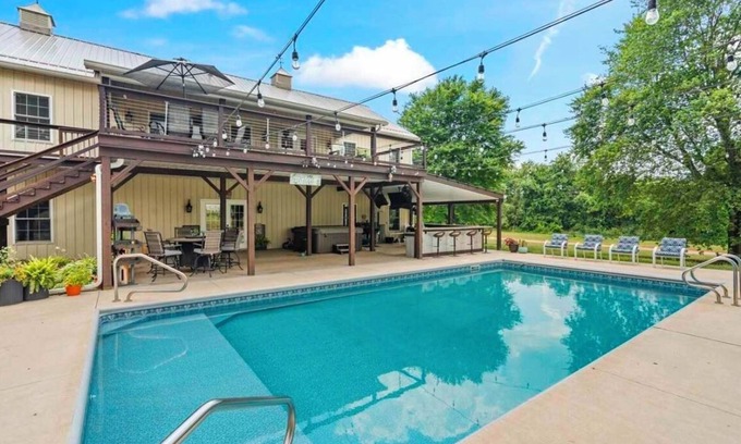 The newest barn from Big Sky Barnhouse (1st in Indiana) is located on 13 private acres w/ an event venue & amenities galore. The outside: saltwater pool, hot tub, fire pit, slide off the deck, pool-side lounge/bar, ATV loop, 8 RV hookups, plus a "Pet Penthouse" for your furry friends. The inside: mini full basketball court that converts to a nerf gun arena & dodgeball court. Also includes a movie theater, wet bar, & arcade. 30 guest max capacity, 7 bedrooms, 19 beds, 3 full bathrooms.