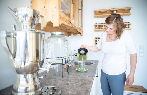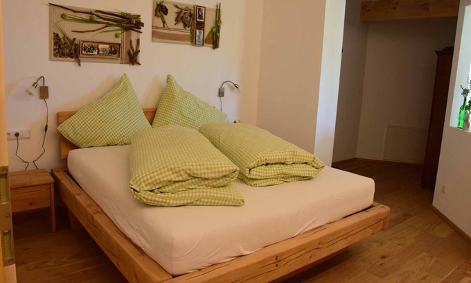 The barrier-free apartment is 60 square meters and is ideal for up to 2 people. The bedroom has a double bed (1.80x2m). You can spend cozy hours in the living room with couch and TV. The separate kitchen is fully equipped with a fridge, dishwasher, microwave, electric stove, kettle, coffee machine and dining table. The bathroom with barrier-free shower, toilet and hairdryer completes the overall picture. Towels and bed linen are provided. Parking free of charge. From the apartment you can go directly into the garden. In the garden there is a swimming pond with a slide. You can get to know many different animal species, from the farm cats to the Benni domestic dog to many farm animals such as chickens, sheep or cows. The hosts offer a whole range of home-made organic products to help you regain your strength after many interesting days.