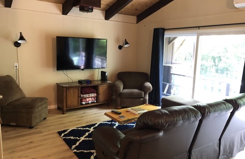 Close to all the White Mountains has to offer, hiking, swimming, skiing, shopping and dining. This newly renovated condo is located in Bartlett, away from the crowds. The first level offers two bedrooms, one a queen and the other a double with bunk beds (maximum top bunk weight is 120lbs) and a full bath with tub and shower. The bedrooms are equipped with tv's and Roku's. There is a small back yard with chairs. Security/wildlife camera outside the front and back door. Upper level is a large open space with a post and beam vaulted ceiling and 16-foot sliding doors that offer seasonal winter views of Attitash and Bear Peak. The condo has a fully stocked kitchen with an island and bar stool seating as well at a 6-person dining table, a leather couch with double recliners positioned in front of a 60" tv with a Roku Stick for streaming and a front and back deck to enjoy a morning coffee or an evening cocktail. All linens/towels/pantry supplies and spices/ paper goods and cleaning products are provided. Just pack your bags and come on up to Bartlett NH! We know you will enjoy your stay!