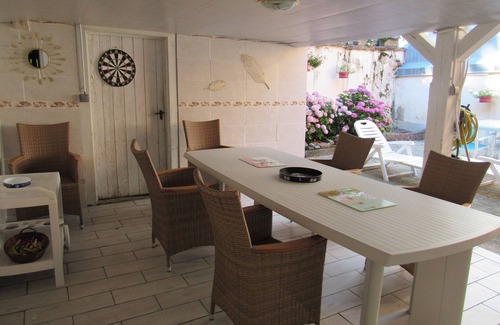 All the bottom of a good cool house in summer with courtyard (barbecue, swing, 2 chaise-longue), beautiful tiled yard, with 2 garden tables (8 and 6 places) ..