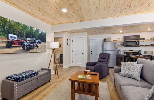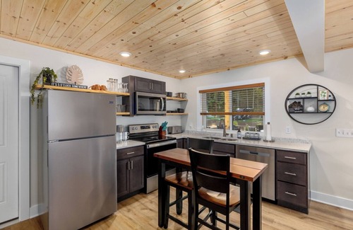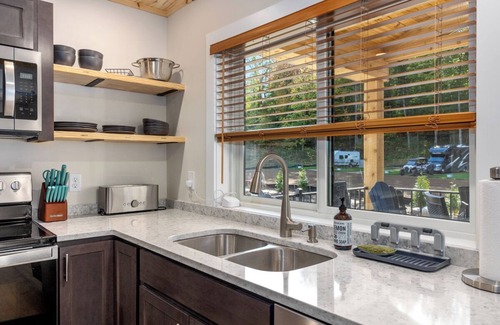 Our largest option boasts 840 sqft and has many extras! Large L shape kitchen with hard surface countertops, dishwasher, full size refrigerator, Keurig coffee maker with K-cups provided, full size range. Large living area with sleeper sofa, 2 eating areas, 65" smart TV for streaming! Full size washer and dryer for your convenience. The Lookout Lodge has a full bath, glass shower doors, and tile surround. Upstairs has a loft, 55" Smart TV, cozy chairs, and bedroom with queen bed.