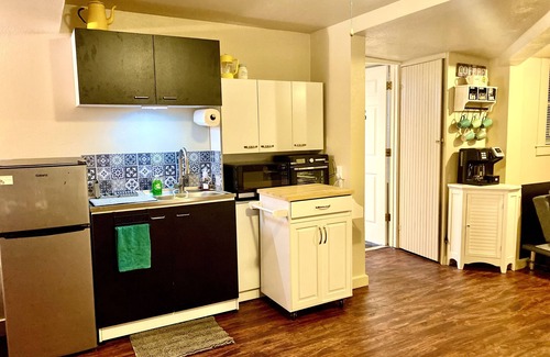 The newly upgraded kitchenette offers all the essentials, including a sink, microwave, air fryer, coffee maker, and a larger mini fridge/freezer. You'll also find two hot plates and an island, giving you the option to whip up a meal. But if cooking isn’t on the agenda, you’re just a short walk from a variety of excellent restaurants—making this apartment ideal for both home chefs and foodies alike.