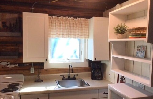 Combination Kitchen/Dining/Living Room: Whip up delicious meals with ease in the fully equipped kitchen while enjoying the rustic charm of the cabin. The interior of this cabin was updated in 2021 with new vinyl flooring, kitchen cabinets, countertops, furnishings and appliances.
