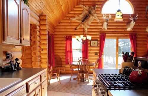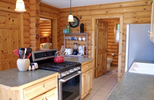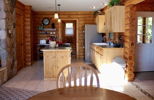 Hickory cabinets, log furnishings, and a beautiful stone wood-burning fireplace give this home a true Up North feel.