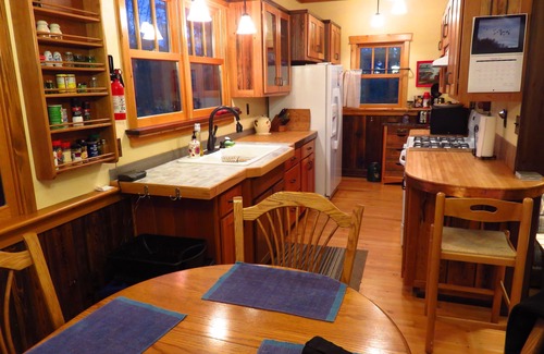 On the inside, Basswood is spare but complete and finely finished with lovely Douglas fir flooring; warm, reclaimed wood paneling and clear pine windows and doors. Offsetting the subdued tones of abundant wood features, paint colors such as “Morning Light” and “Crystalline” lend brightness to the ceilings and certain walls. Our main level consists of the kitchen, living room and dining area, and the adjacent master bedroom and bathroom. On warm nights it is pleasant to sleep with the French doors open to the screen porch, and wake to loons calling and the conversations of morning birds. A ship’s ladder leads guests to the loft which we’ve furnished with one full size bed, one twin bed and ample seating. The loft is a nice place to read on a stormy day. A feature window captures eagle-eye views across Cotton Lake to forested Shelley Island. Guests who take the loft accomodations will enjoy their own full bath as well.