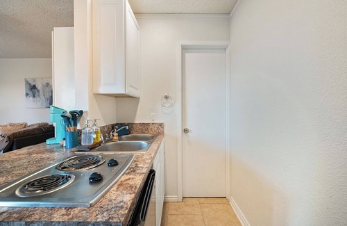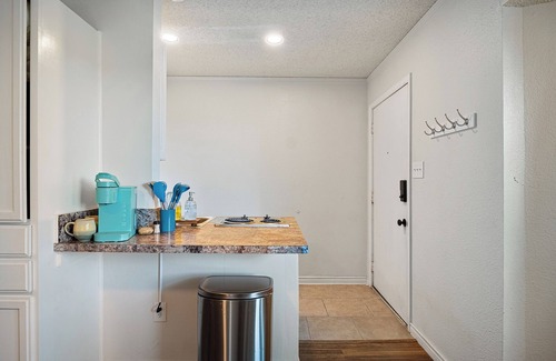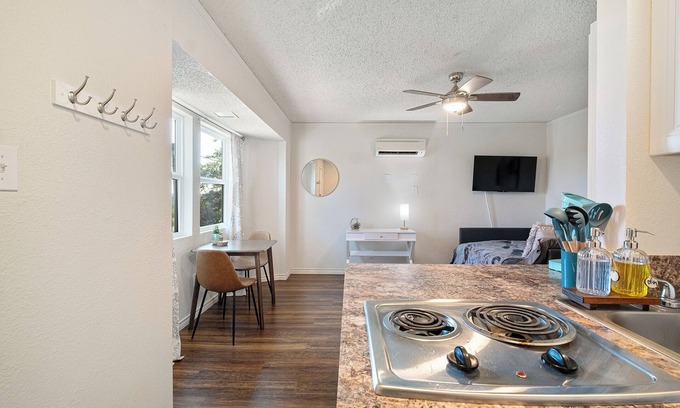 Escape to this adorable studio in picturesque Bastrop. This unit is in a triplex converted from a single family home. The unit has a private entry and is perfect for business travelers or an extended stay. Included is high-speed internet with a dedicated workspace, as well as a large smart TV where you can access your streaming accounts (Netflix, Hulu, etc). The outdoor space is a pine-tree covered double lot in Bastrop. This space includes a kitchenette with a stove top, microwave, mini-fridge & Keurig. If booking for 30+ days, a brief rental agreement is required.