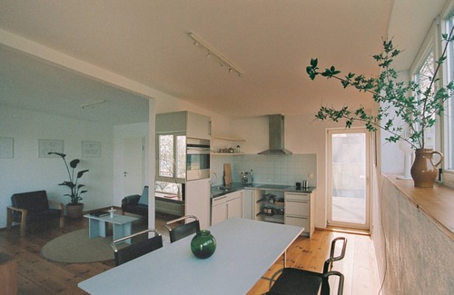 The apartment "Bauhaus an der Havel" is located on the upper floor of a building in the classic modernist style - directly on the banks of the river Havel with a view of the island-town of Werder. On 45 square meters there is an open kitchen with dining area, the living area with a view of the water and the church of Werder as well as a bedroom with adjoining bathroom. The apartment has a 17 sqm roof terrace and its own landing stage.