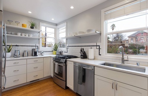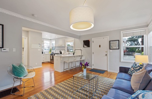Spacious updated one bedroom Art Deco home, conveniently located outside of downtown San Francisco. A 5 minute walk to Alameda's historic Park Street, featuring local shops, restaurants, bars and a movie theater. This Art Deco period home was recently updated, keeping the charm and character original to the property. Enjoy relaxing in this light filled home, with east, south, and west-facing windows. Spacious, eat-in, kitchen with stainless steel appliances, beautiful stone countertops, and detailed Art Deco period details and backsplash. The bathroom features include large sit-in shower with twin rain shower heads and period tile work. Large master bedroom with king bed, high-boy dresser, and walk-in closet. Central AC for cooling during the warm summer months. Brand new private Whirlpool front loader washer and dryer onsite. Enjoy dining outdoors in private patio space with bistro set and colorful bougainvillea. Direct TV Sunday Ticket access with WiFi and print/copy/scan onsite.