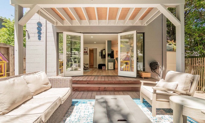 Walk to downtown shops and local attractions. The home offers family-friendly amenities, including backyard with a fire pit, playhouse, and outdoor seating.