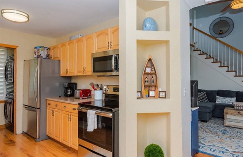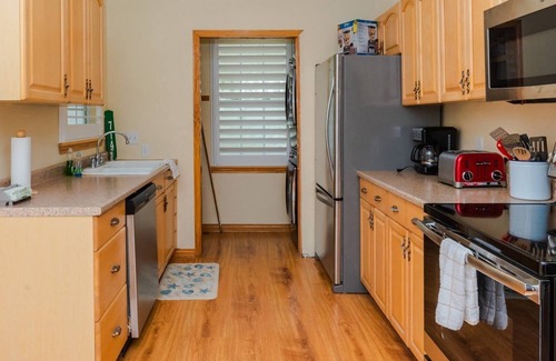 Inside, the open-concept living and dining areas feature sweeping views of the bay, creating a tranquil space to unwind. The cozy living room offers a sleeper sofa, and a convenient half-bath is nearby. The fully-equipped kitchen has everything you need to cook up a feast, or you can fire up the BBQ grill for an outdoor cookout.