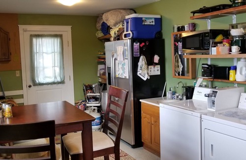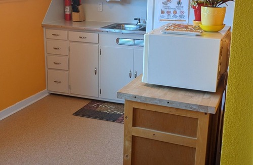 Bay Cove Cottage A is one side of a rustic 1940s cottage duplex. Cottage A is closest to the highway, so there is road noise. It is a clean and cozy, brightly colored, 550 sq ft apartment with one bedroom and a fold-out couch in the living room. The kitchen and bathroom with shower are simple, and retain original vintage character. There is no stove or oven, but a microwave, skillet, a portable single burner rangette, for preparation of simple meals, and a refrigerator are provided in the kitchen. The vintage bathroom is small, with no tub and the shower has a small entry (16 inches wide). We are offering the cottages as the budget option of Bay Cove properties and offer few amenities. Cable TV is provided, wifi is available throughout, there is a full-sized refrigerator with ice maker, and a coin-operated laundry service in a separate room in the duplex. Cottage A is the side of the duplex next to Cape Arago Hwy, and has more road noise than Cottage B. There is no bay view from the apartment, but a small backyard and a small patio available for a spectacular view of the bay and Charleston harbor. A laundry room with tall table and chairs offers great bay views while enjoying coffee or a glass of wine, when the weather is not suitable for patio use. The owner's residence is nearby, on the same lot as the cottages, and may also be rented. We can direct you to easy bayshore access that requires a 500 foot walk along Cape Arago Hwy., or other easy bay access for clamming or crabbing within short driving distances.