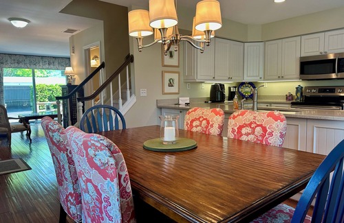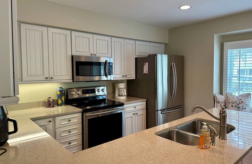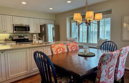 This beautifully designed condo has an open kitchen and dining area that is great for cooking and conversation. The living room is just on the other side of the dining area and features a flat screen tv and fireplace. The deck is adjacent to the living area with a charcoal grill and awning. Both bedrooms are located on the second floor, each with adjoining bathrooms. The primary bedroom has a king bed and the guest room has two twin beds. This condo is refreshingly updated and meticulously maintained. It is located in one of the best spots in town, close to beaches, parks and Main Street.