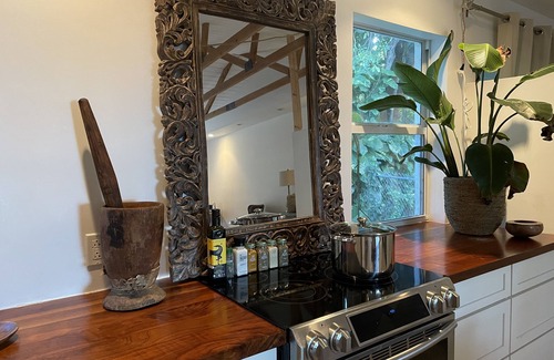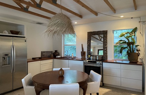 Unwind with a Bay view, approx. 1 hour from Miami airport. Access to mini beach, great sunsets and boat ramp, swimming, kayaks and paddle board. Fully stocked kitchen with organic oils and slices. Close to great restaurants, shops and just 1 mile to the best beach in the upper keys. White linens compliment teak furniture from Bali, Morrocan light fixtures, custom walnut countertops, marble restoration hardware vanities and wing backs from pottery barn. Tropical garden, outdoor dinning & private patios with water views. Relax on your covered porch on lux chairs from Restoration Hardware Ibiza collection, or dine alfresco. Unwind in the garden overlooking the water while sitting in wingback chairs from Pottery Barn. Sit under the palm trees and native jumpo limbo trees while watching the water.