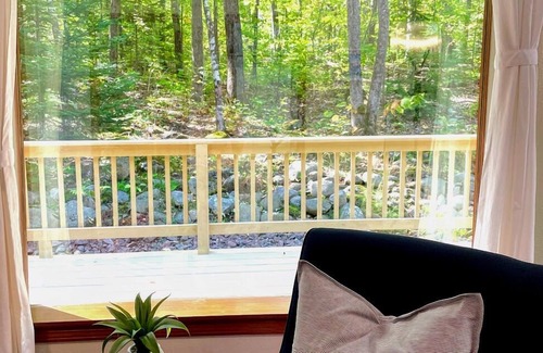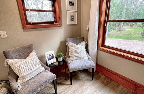 Our Rock Garden Cottage begins with a view of our rock garden as you drive up, a beautiful perennial garden, as well as an outdoor firepit surrounded by cedar chips and solar lit tiki torches. As you enter the 2-level cottage the main level bedroom has two queen beds comfortably sleeping four. Up the stairs the 2nd level offers a large walk in closet, spacious bathroom with granite countertops, a large walk-in Italian marble shower with complimentary toiletries, heat fan and towel warmer, great in the cooler months. Two windows show a view overlooking the rock garden. On the other half of the 2nd floor there is an open layout kitchen- living room with high ceilings, electric fireplace perfect to get cozy in front of, futon that converts down to make a full bed, and large 3-window view of the woods brings in a lot of natural light.