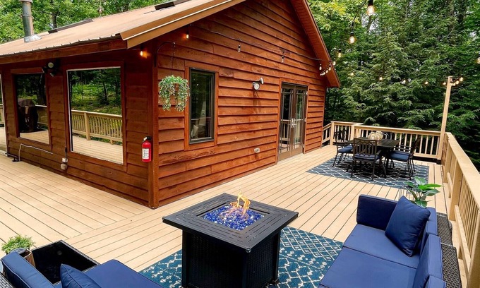 Our one of a kind Main Cottage features 2 huge panoramic windows & cozy propane fireplace in the living room viewing the backwoods as well as a 1k sq ft unique wrap around deck and outdoor dining/lounge couch with propane fireplace. Perfect to relax and unwind after a day exploring Bayfield (outdoor features are seasonal Mid April-October) Starlink fast internet w/Netflix, fully stocked kitchen, complimentary bathroom toiletries.