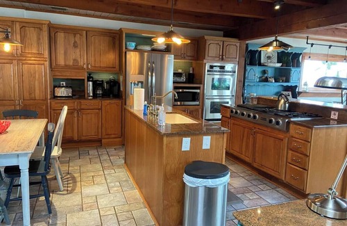 This unique home has a beautiful open floor plan with gorgeous natural light and timeless cedar and cypress beams. It is well-equipped with a well-stocked kitchen, dining and family living rooms, and much outdoor seating, all overlooking the water. Featuring two kitchens, two laundry units, and ample space to sleep 24 people on mattresses (w/ 2 additional fold-up twins and a queen), this home is the ideal location for family reunions, conferences, and retreats.