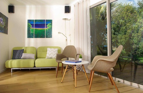 The second bedroom features a queen bed and big doors that lead to a private outdoor area and a beautiful garden with seating, perfect for moments of quiet reflection.