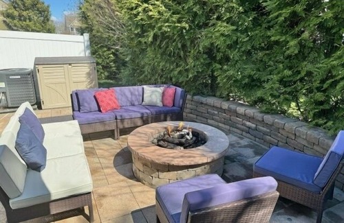 This home boasts an outdoor built-in gas fire pit with sectional sofa for those chilly summer nights and s'mores after your barbecue feast on the large gas grill and outdoor dining area.