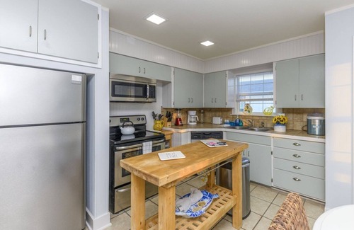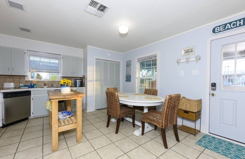 Decorated in coastal cream and blues, the living room offers comfortable seating for at up to seven. Water views out of each window compete with the large flat-screen TV. The futon folds out into a full-sized bed for extra sleeping accommodations for the kiddos only in the common area. This charming kitchen offers a complete array of appliances, including a dishwasher and ice maker. The attached informal dining area seats four and offers views of the canal.