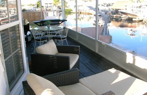 Tropical retreat with waterfront pool and Tiki Hut. Sit on the screened porch and enjoy an afternoon siesta. Venture inside to a designated game area with game table set for cards, dominoes etc. The Living room has a large screen TV with comfortable lounges to enjoy after a long day on the water. A boat can be added to rental for a nominal fee.