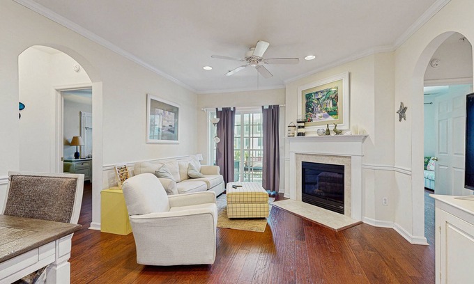 Escape to this bright and cheerful, second-floor condo located just steps from a host of resort amenities! Inside this colorful, single-level getaway, you'll find a well-equipped, full kitchen, a dining table for six, and a sunlit living area with a gas fireplace and a TV for streaming your favorite shows and movies. Step out into your furnished, screened balcony overlooking the courtyard - the ideal spot for quiet afternoon reading or evening cocktails.