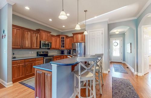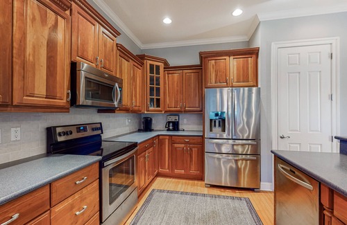 This spacious five-bedroom home - approximately 3,800 square feet - is a great place to relax and enjoy your vacation. This lovely home is packed with many extras to help make your vacation memorable. The first floor features four bedrooms, including a main suite with jet tub and a deluxe shower. The garage has been converted to a game room with Ping-Pong, electronic dart board, air hockey, and foosball. The garage also has air-conditioning to help with the hot summer days and nights. Enjoy the 75-inch 3D TV with surround sound and 3D Blu-ray player in the living area! Featuring two picnic tables, the patio also offers a gas grill for barbecues. Plus, central air-conditioning, well-equipped kitchen, and washer/dryer. Non-smoking.6 TVs, 5 DVDs, a Blu-ray player, Keurig, Netflix, gas fireplace, WiFi., board games, outdoor shower, gas grill.