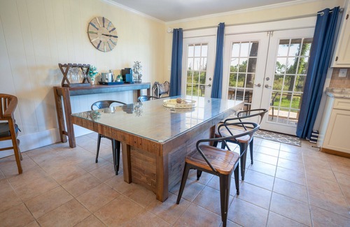 The well-equipped kitchen has everything you’ll need to prepare your fresh catch of the day and has a bonus crockpot and electric skillet. The dining table seats 6 with additional seating for 3 at the large kitchen island. French doors in this space open onto the furnished screened-in veranda overlooking the hot tub and private pond with bridge.