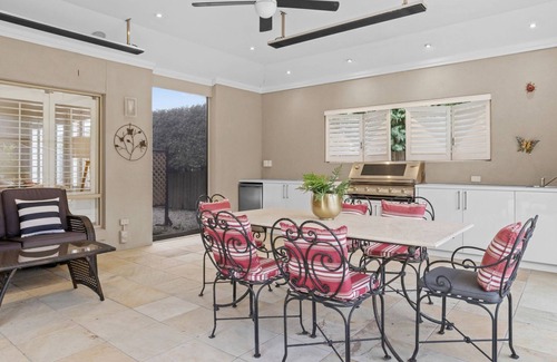 Undercover outdoor kitchen with 5-burner BBQ, sink, bar fridge, ceiling fan & heaters