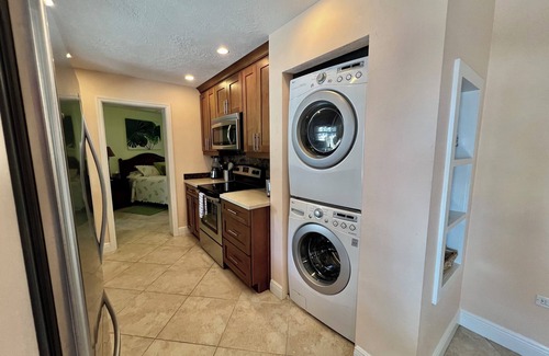 The villa itself comes with a fully-equipped new stainless kitchen, full size LG washer and dryer, linens, two queen and one king beds, Cable TV, and a dining room. French doors in the dining area face the bay, spacious 700 square foot patio,and marina giving the feeling of the outdoors being in. Beautiful glass block showers with pebble floors are in both baths.